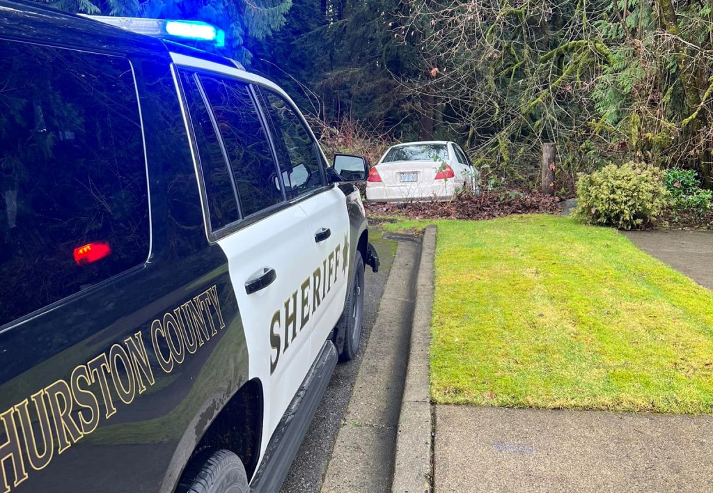 The vehicle then turned northbound on Yauger Way into the Grass lake neighborhood, where it collided with at least one parked car. It continued westbound on 6th Ave to Miter Dr NW at the dead end. The vehicle crashed into the tree line and the male driver and female passenger both fled on foot.