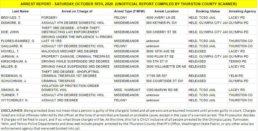The Arrest Report is now available for Saturday, October 17th, 2020. Agencies in Thurston County made 3 felony arrests, 10 misdemeanor arrests, and 1 warrant arrest (0 felony, 1 misdemeanor) – for a total of 14.