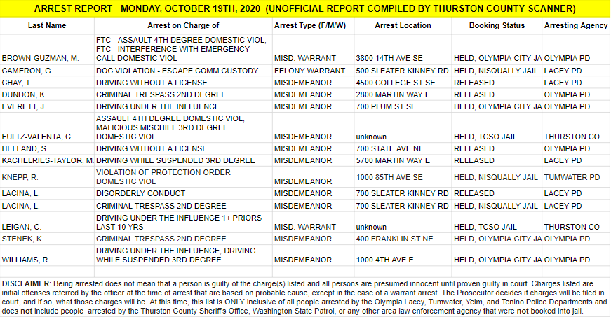 The Arrest Report is now available for Monday, October 19th, 2020. Agencies in Thurston County made 11 misdemeanor arrests, and 3 warrant arrest (1 felony, 2 misdemeanor) – for a total of 14.