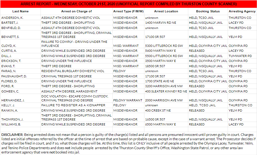 The Arrest Report is now available for Wednesday, October 21st, 2020. Agencies in Thurston County made 2 felony arrests, 12 misdemeanor arrests, and 4 warrant arrest (1 felony, 3 misdemeanor) – for a total of 18.