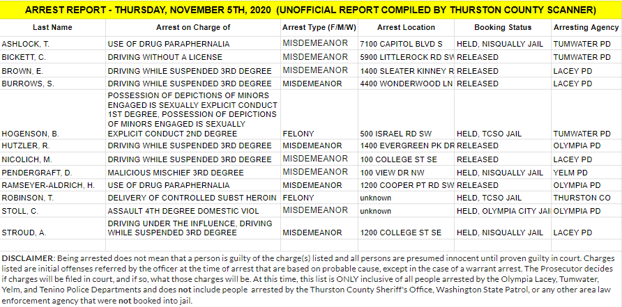 The Arrest Report is now available for Thursday, November 5th, 2020. Agencies in Thurston County made 2 felony arrests and 10 misdemeanor arrests, for a total of 12.