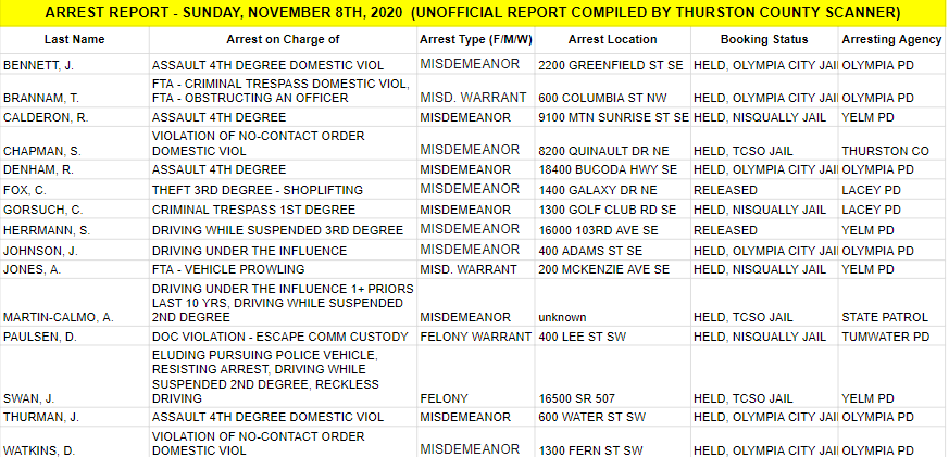 The Arrest Report is now available for Sunday, November 8th, 2020. Agencies in Thurston County made 1 felony arrest, 11 misdemeanor arrests, and 3 warrant arrests (1 felony, 2 misdemeanor) for a total of 15.