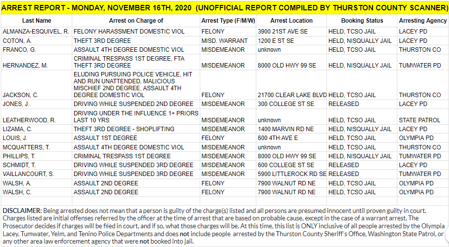 The Arrest Report is now available for Monday, November 16th, 2020. Agencies in Thurston County made 5 felony arrests, 9 misdemeanor arrests and 1 warrant arrests (0 felony, 1 misdemeanor) for a total of 15.