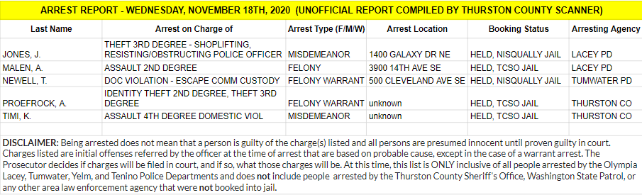 The Arrest Report is now available for Wednesday, November 18th, 2020. Agencies in Thurston County made 1 felony arrests, 2 misdemeanor arrests and 2 warrant arrests (2 felony, 0 misdemeanor) for a total of 5.