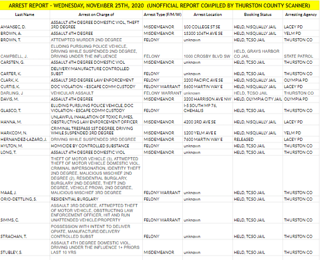 The Arrest Report is now available for Wednesday, November 25th, 2020. Agencies in Thurston County made 8 felony arrests, 9 misdemeanor arrests, and 4 warrant arrests (4 felony, 0 misdemeanor) for a total of 21.