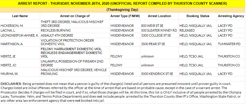 The Arrest Report is now available for Thursday, November 26th, 2020. Agencies in Thurston County made 2 felony arrests and 5 misdemeanor arrests for a total of 7.