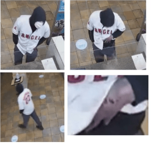 The robbery occurred at 9:30 pm on Monday, Nov. 23. The suspect is described as a Hispanic male, approximately 6 feet tall, wearing a Los Angeles Angels #27 (Guerrero) jersey, and has tattoos/marks on the back of his left hand.