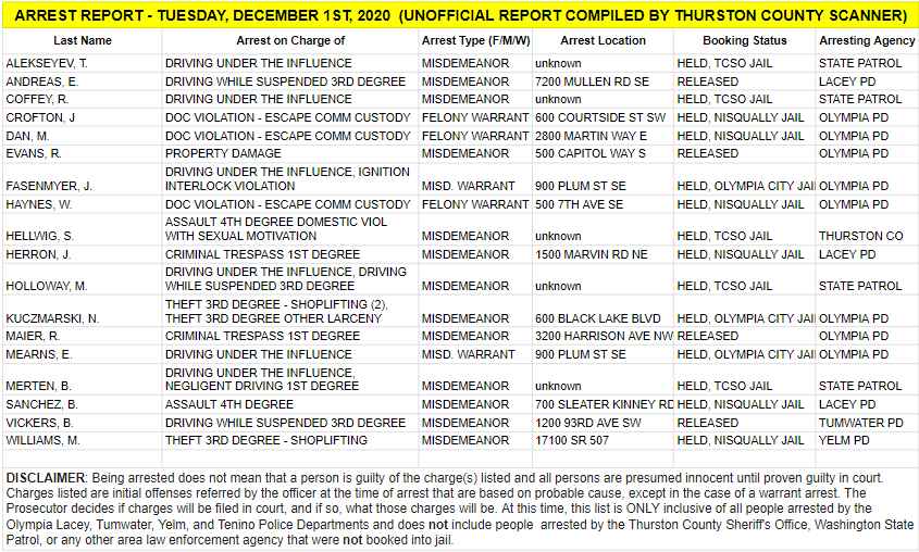 The Arrest Report is now available for Tuesday, December 1st, 2020. Agencies in Thurston County made 13 misdemeanor arrests and 5 warrant arrests (3 felony, 2 misdemeanor) for a total of 18.