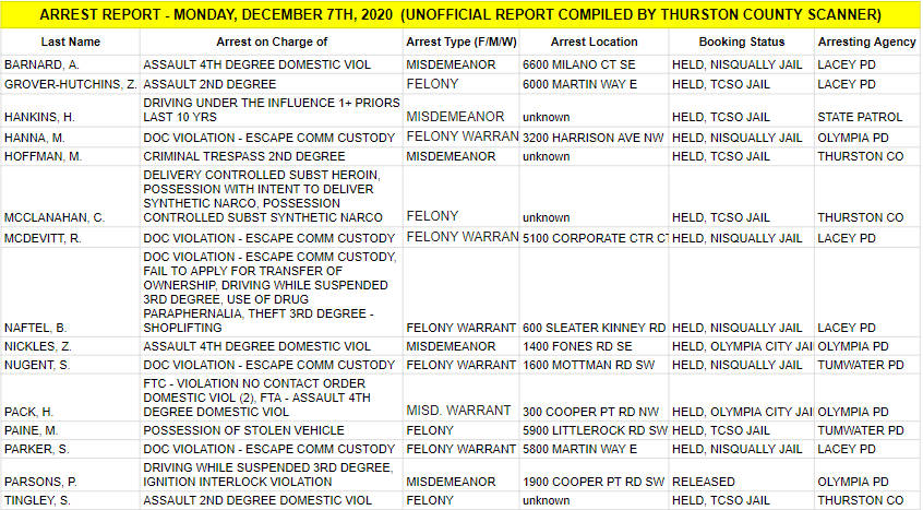 The Arrest Report is now available for Monday, December 7th, 2020. Agencies in Thurston County made 4 felony arrests, 5 misdemeanor arrests and 6 warrant arrest (5 felony, 1 misdemeanor) for a total of 15.