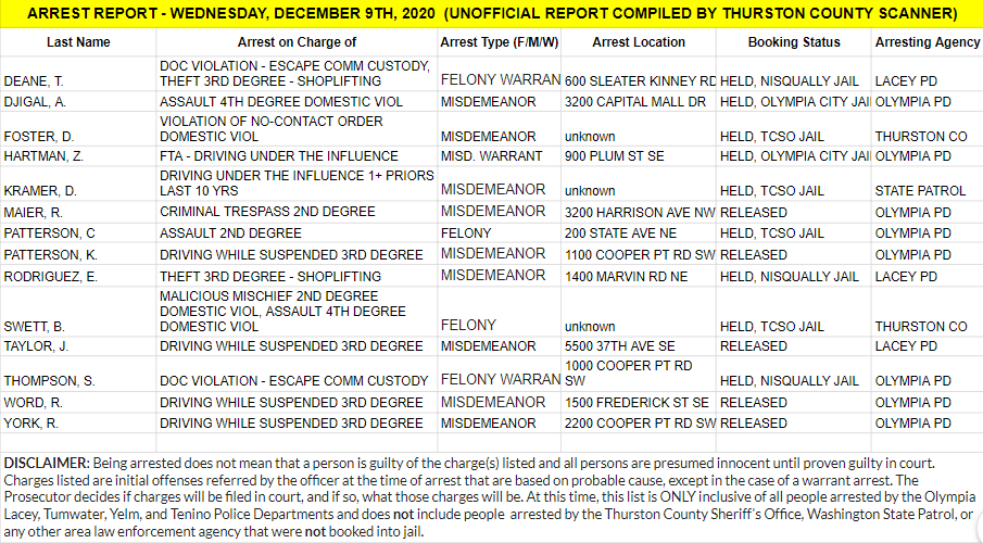 The Arrest Report is now available for Wednesday, December 9th, 2020. Agencies in Thurston County made 2 felony arrests, 9 misdemeanor arrests and 3 warrant arrest (2 felony, 1 misdemeanor) for a total of 14.