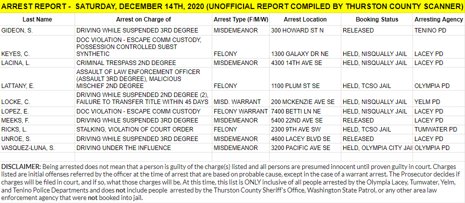 The Arrest Report is now available for Monday, December 14th, 2020. Agencies in Thurston County made 3 felony arrests, 5 misdemeanor arrests, and 2 warrant arrest (1 felony, 1 misdemeanor) for a total of 10.