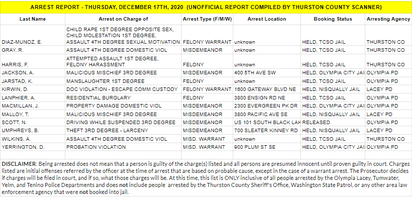 The Arrest Report is now available for Thursday, December 17th, 2020. Agencies in Thurston County made 3 felony arrest, 6 misdemeanor arrests, and 4 warrant arrest (2 felony, 2 misdemeanor) for a total of 13.
