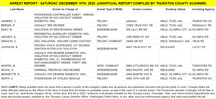 The Arrest Report is now available for Saturday, December 19th, 2020. Agencies in Thurston County made 4 felony arrests, 4 misdemeanor arrests, and 2 warrant arrests (1 felony, 1 misdemeanor) for a total of 10.