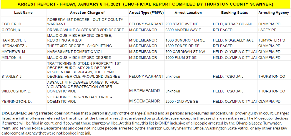 The Arrest Report is now available for Friday, January 8th, 2021. Agencies in Thurston County made 7 misdemeanor arrests, and 2 warrant arrests (2 felony, 0 misdemeanor) for a total of 9.