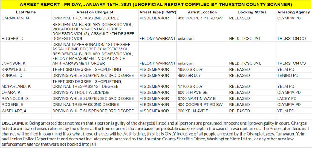 The Arrest Report is now available for Friday, January 15th, 2021. Agencies in Thurston County made 8 misdemeanor arrests and 2 warrant arrests (2 felony, 0 misdemeanor) for a total of 1`0.