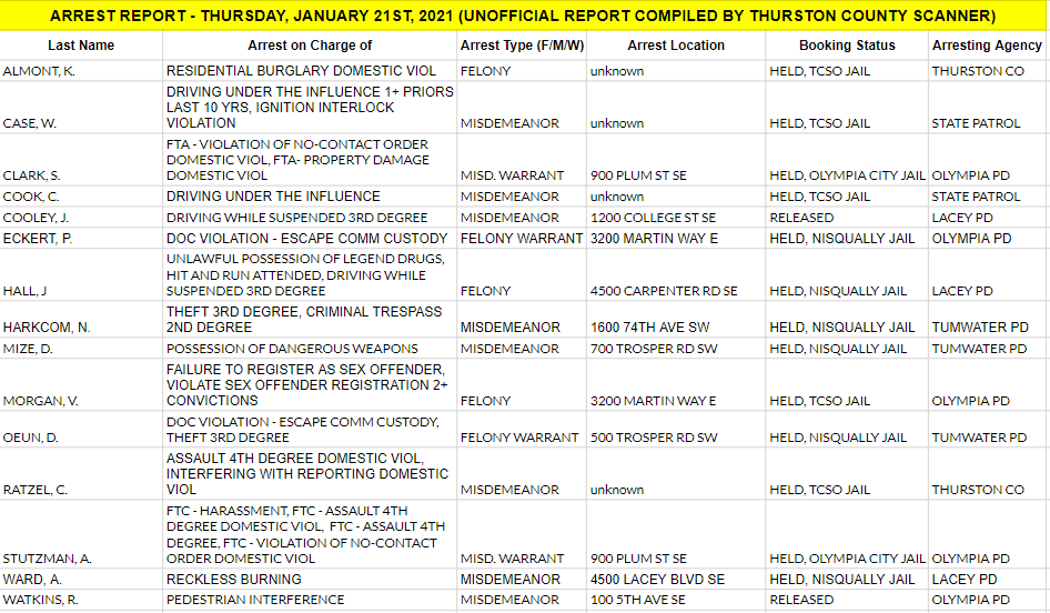 The Arrest Report is now available for Thursday, January 21st, 2021. Agencies in Thurston County made 3 felony arrests, 8 misdemeanor arrests, and 4 warrant arrests (2 felony, 2 misdemeanor) for a total of 15.