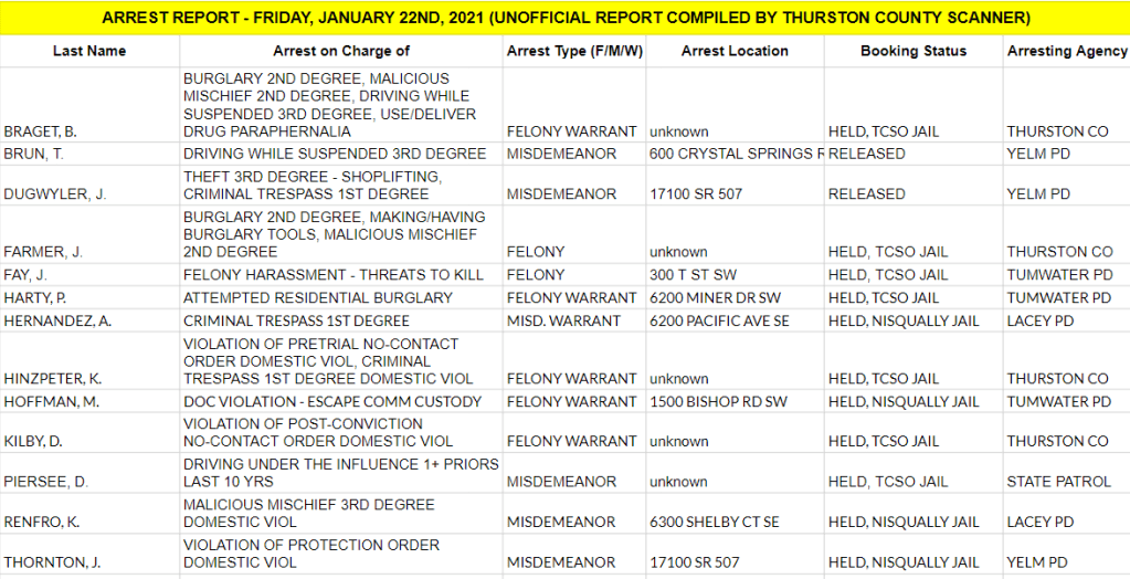 The Arrest Report is now available for Friday, January 22nd, 2021. Agencies in Thurston County made 2 felony arrests, 5 misdemeanor arrests, and 6 warrant arrests (5 felony, 1 misdemeanor) for a total of 13.