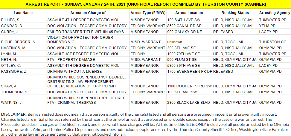 The Arrest Report is now available for Sunday, January 24th, 2021. Agencies in Thurston County made 1 felony arrest, 6 misdemeanor arrests, and 5 warrant arrests (3 felony, 2 misdemeanor) for a total of 12.
