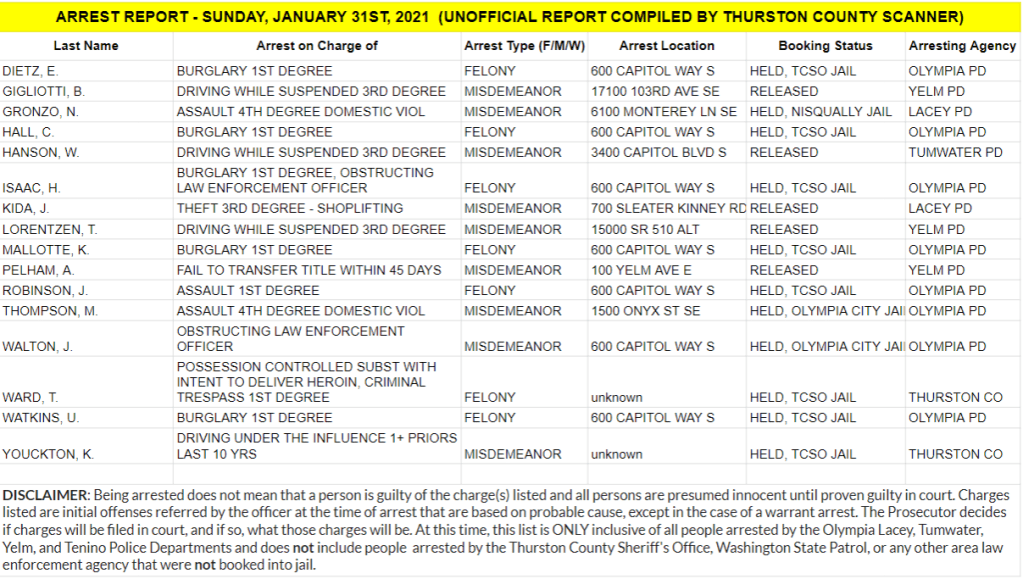 The Arrest Report is now available for Sunday, January 31st, 2021. Agencies in Thurston County made 7 felony arrests, 9 misdemeanor arrests for a total of 16.