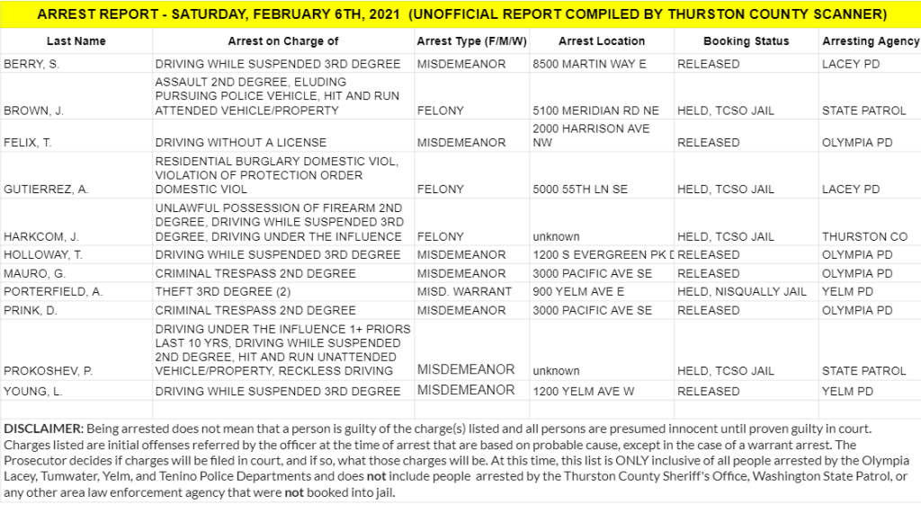 The Arrest Report is now available for Saturday, February 6th, 2021. Agencies in Thurston County made 3 felony arrests, 7 misdemeanor arrests, and 1 warrant arrests (0 felony, 1 misdemeanor) for a total of 11.