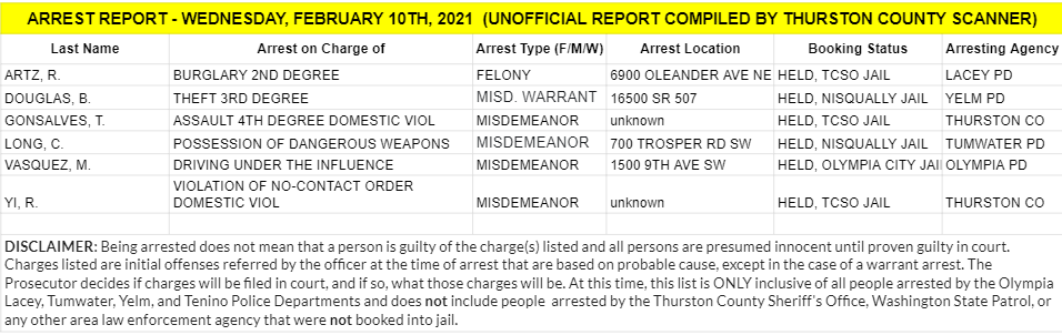 The Arrest Report is now available for Wednesday, February 10th, 2021. Agencies in Thurston County made 1 felony arrest, 4 misdemeanor arrests, and 1 warrant arrest (0 felony, 1 misdemeanor) for a total of 6.