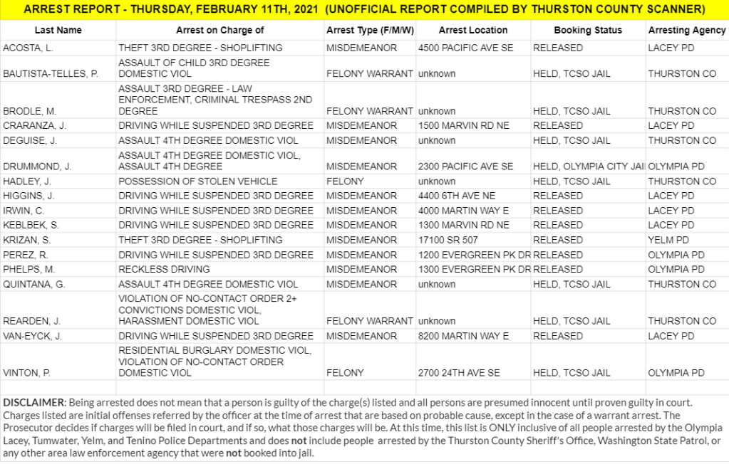 The Arrest Report is now available for Thursday, February 11th, 2021. Agencies in Thurston County made 2 felony arrests, 12 misdemeanor arrests, and 3 warrant arrest (3 felony, 0 misdemeanor) for a total of 17.
