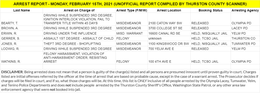 The Arrest Report is now available for Monday, February 15th, 2021. Agencies in Thurston County made 2 felony arrest, 4 misdemeanor arrests, and 1 warrant arrest (0 felony, 1 misdemeanor) for a total of 7.