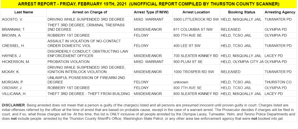 The Arrest Report is now available for Friday, February 19th, 2021. Agencies in Thurston County made 4 felony arrests, 4 misdemeanor arrests, and 2 warrant arrest (0 felony, 2 misdemeanor) for a total of 10.
