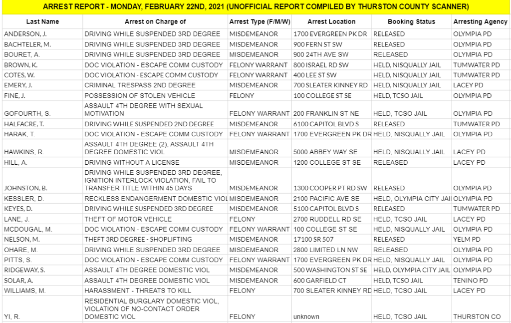 The Arrest Report is now available for Monday, February 22nd, 2021. Agencies in Thurston County made 4 felony arrests, 14 misdemeanor arrests, and 6 warrant arrests (6 felony, 0 misdemeanor) for a total of 24.