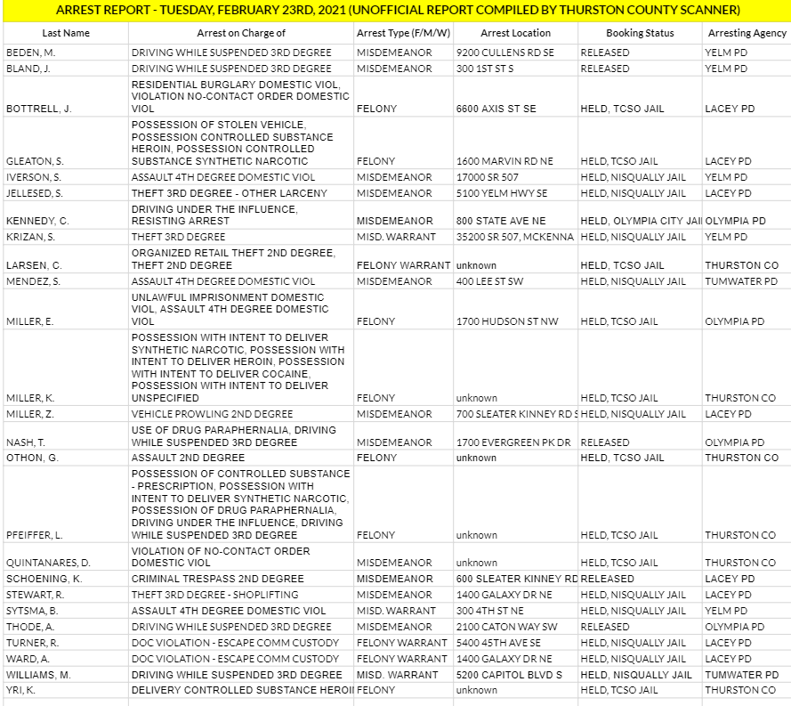 The Arrest Report is now available for Tuesday, February 23rd, 2021. Agencies in Thurston County made 7 felony arrests, 12 misdemeanor arrests, and 6 warrant arrests (3 felony, 3 misdemeanor) for a total of 25.