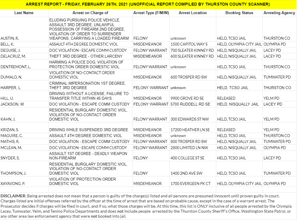 The Arrest Report is now available for Friday, February 26th, 2021. Agencies in Thurston County made 3 felony arrests, 7 misdemeanor arrests, and 7 warrant arrests (7 felony, 0 misdemeanor) for a total of 17.