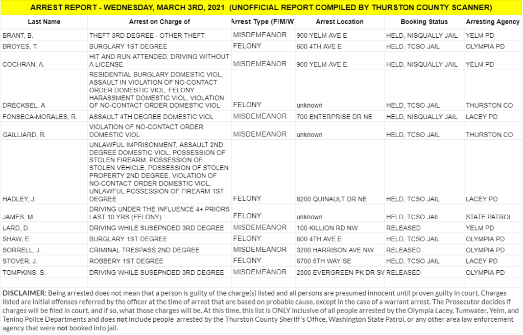 The Arrest Report is now available for Wednesday, March 3rd, 2021. Agencies in Thurston County made 6 felony arrests and 7 misdemeanor arrests for a total of 13.