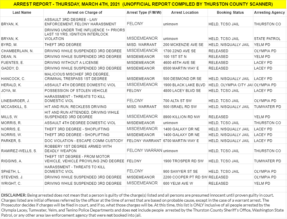 The Arrest Report is now available for Thursday, March 4th, 2021. Agencies in Thurston County made 5 felony arrests, 13 misdemeanor arrests, and 4 warrant arrests (2 felony, 2 misdemeanor) for a total of 22.