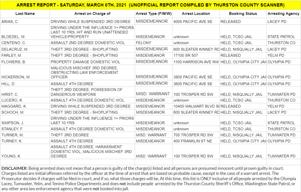 The Arrest Report is now available for Saturday, March 6th, 2021. Agencies in Thurston County made 1 felony arrest, 13 misdemeanor arrests, and 3 warrant arrests (0 felony, 3 misdemeanor) for a total of 17.