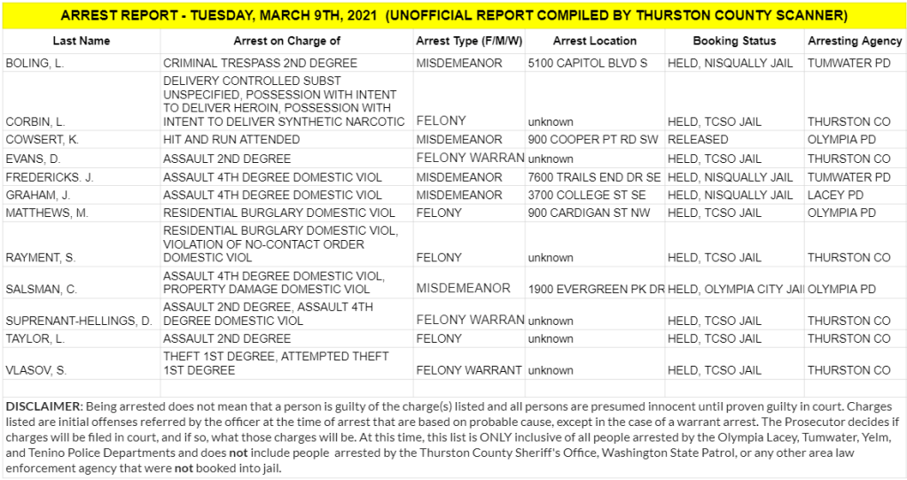 The Arrest Report is now available for Tuesday, March 9th, 2021. Agencies in Thurston County made 4 felony arrests, 5 misdemeanor arrests, and 3 warrant arrests (3 felony, 0 misdemeanor) for a total of 12.