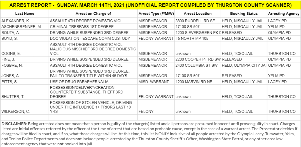The Arrest Report is now available for Sunday, March 14th, 2021. Agencies in Thurston County made 1 felony arrest, 7 misdemeanor arrests, and 3 warrant arrests (2 felony, 1 misdemeanor) for a total of 1`1.