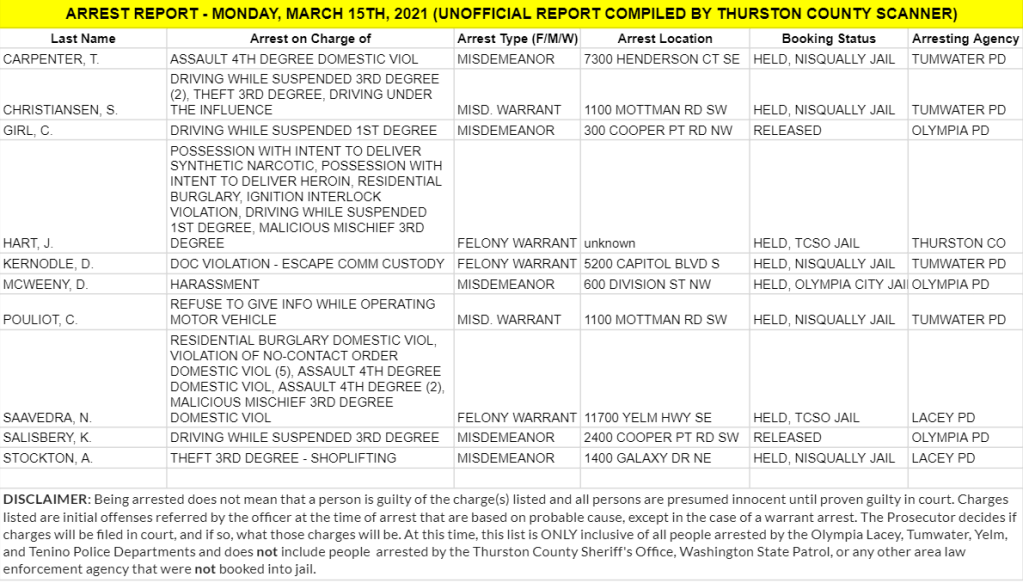 The Arrest Report is now available for Monday, March 15th, 2021. Agencies in Thurston County made 5 misdemeanor arrests, and 5 warrant arrests (3 felony, 2 misdemeanor) for a total of 1`0.