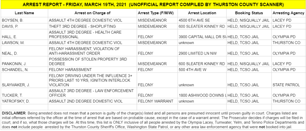 The Arrest Report is now available for Friday, March 19th, 2021. Agencies in Thurston County made 5 felony arrests, 4 misdemeanor arrests, and 1 warrant arrests (1 felony, 0 misdemeanor) for a total of 10.