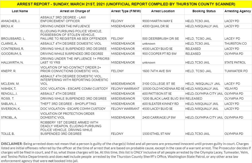 The Arrest Report is now available for Sunday, March 21st, 2021. Agencies in Thurston County made 4 felony arrests, 10 misdemeanor arrests and 2 warrant arrests (2 felony, 0 misdemeanor) for a total of 16.