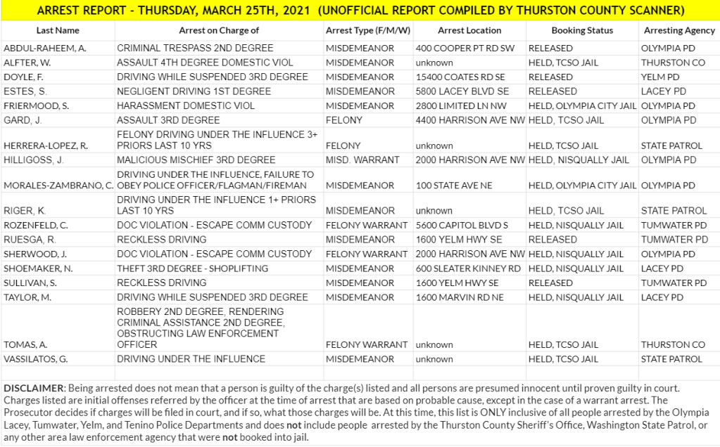 The Arrest Report is now available for Thursday, March 25th, 2021. Agencies in Thurston County made 2 felony arrests, 12 misdemeanor arrests and 4 warrant arrests (2 felony, 2 misdemeanor) for a total of 18.