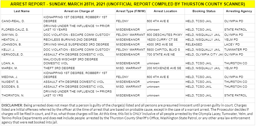 The Arrest Report is now available for Sunday, March 28th, 2021. Agencies in Thurston County made 2 felony arrests, 7 misdemeanor arrests and 4 warrant arrests (2 felony, 2 misdemeanor) for a total of 13.