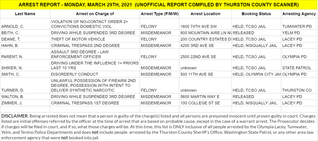 The Arrest Report is now available for Monday, March 29th, 2021. Agencies in Thurston County made 4 felony arrests and 6 misdemeanor arrests for a total of 10.