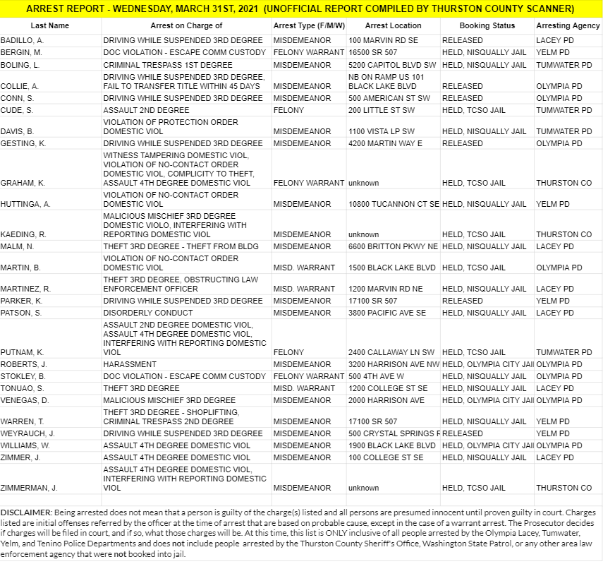 The Arrest Report is now available for Wednesday, March 31st, 2021. Agencies in Thurston County made 2 felony arrests, 18 misdemeanor arrests and 6 warrant arrests (3 felony, 3 misdemeanor) for a total of 26.