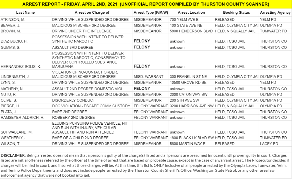 The Arrest Report is now available for Friday, April 2nd, 2021. Agencies in Thurston County made 4 felony arrests, 7 misdemeanor arrests and 6 warrant arrests (5 felony, 1 misdemeanor) for a total of 17.