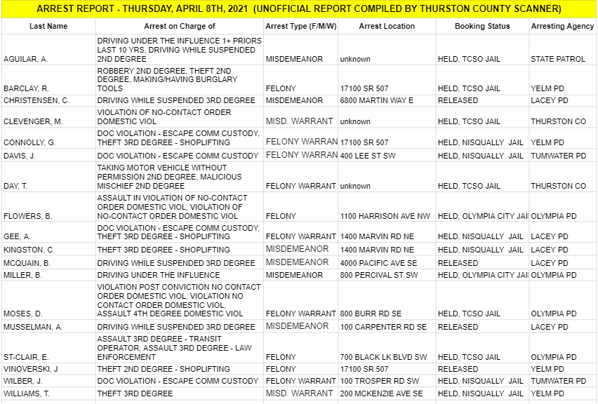 The Arrest Report is now available for Thursday, April 8th, 2021. Agencies in Thurston County made 4 felony arrests, 6 misdemeanor arrests and 8 warrant arrests (6 felony, 2 misdemeanor) for a total of 18.