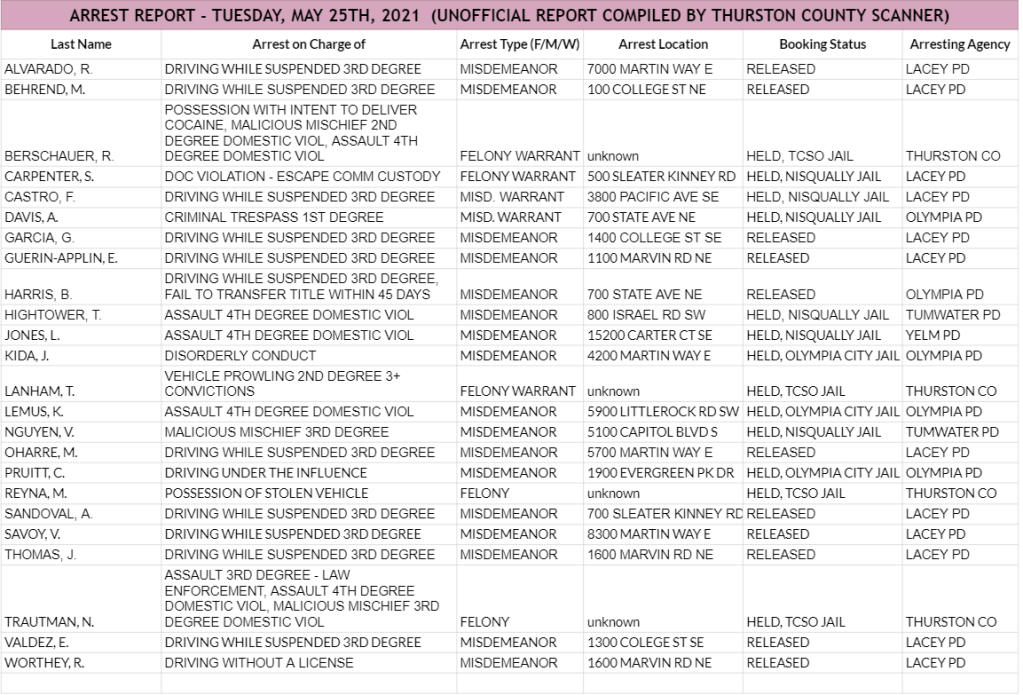 The Arrest Report is now available for Tuesday, May 25th, 2021. Agencies in Thurston County made 2 felony arrests, 17 misdemeanor arrests, and 5 warrant arrest (3 felony, 2 misdemeanor) for a total of 24.