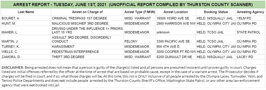 The Arrest Report is now available for Tuesday, June 1st, 2021. Agencies in Thurston County made 1 felony arrest, 4 misdemeanor arrests, and 2 warrant arrests (0 felony, 2 misdemeanor) for a total of 7.