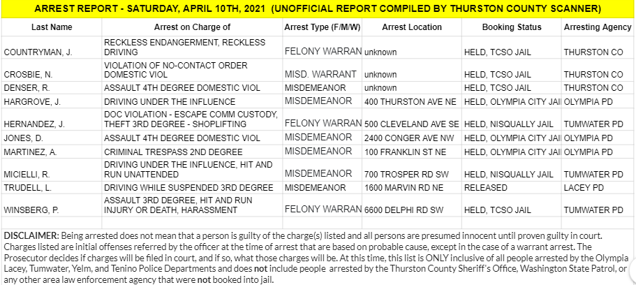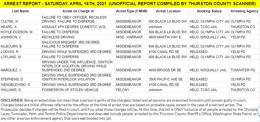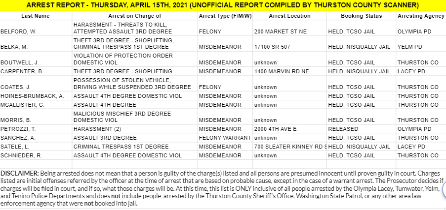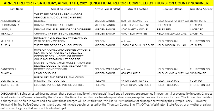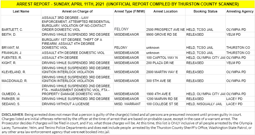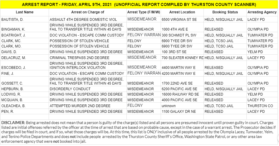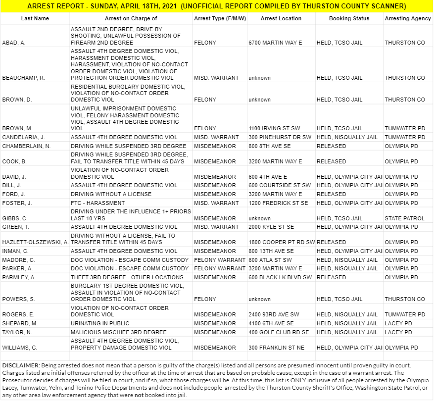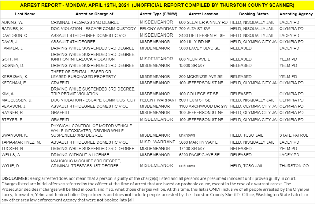 The Arrest Report is now available for Sunday, April 18th, 2021. Agencies in Thurston County made 4 felony arrests, 13 misdemeanor arrests and 6 warrant arrests (2 felony, 4 misdemeanor) for a total of 23.