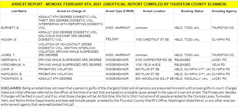 The Arrest Report is now available for Thursday, February 11th, 2021. Agencies in Thurston County made 2 felony arrests, 12 misdemeanor arrests, and 3 warrant arrest (3 felony, 0 misdemeanor) for a total of 17.