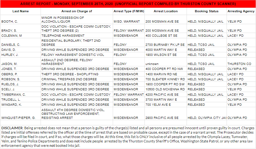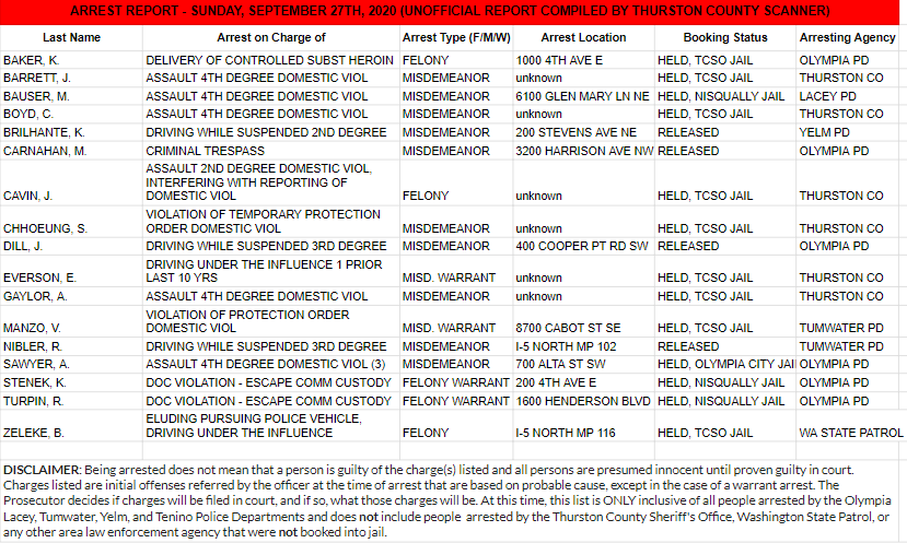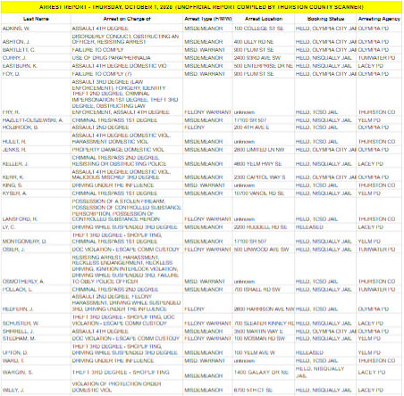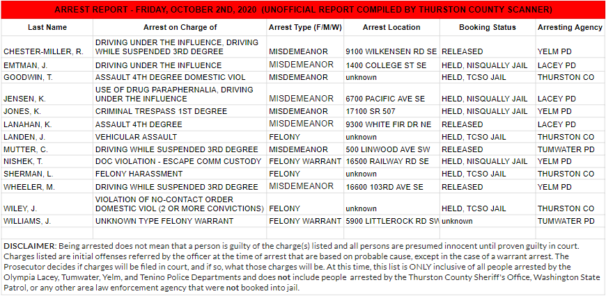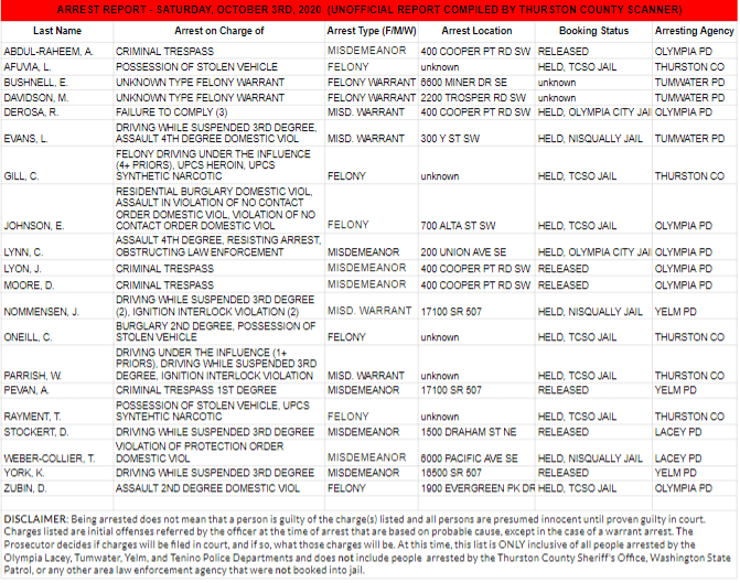 The Arrest Report is now available for Saturday, October 3rd, 2020. Agencies in Thurston County made 6 felony arrests, 8 misdemeanor arrests, and 6 warrant arrests (2 felony, 4 misdemeanor) – for a total of 20.